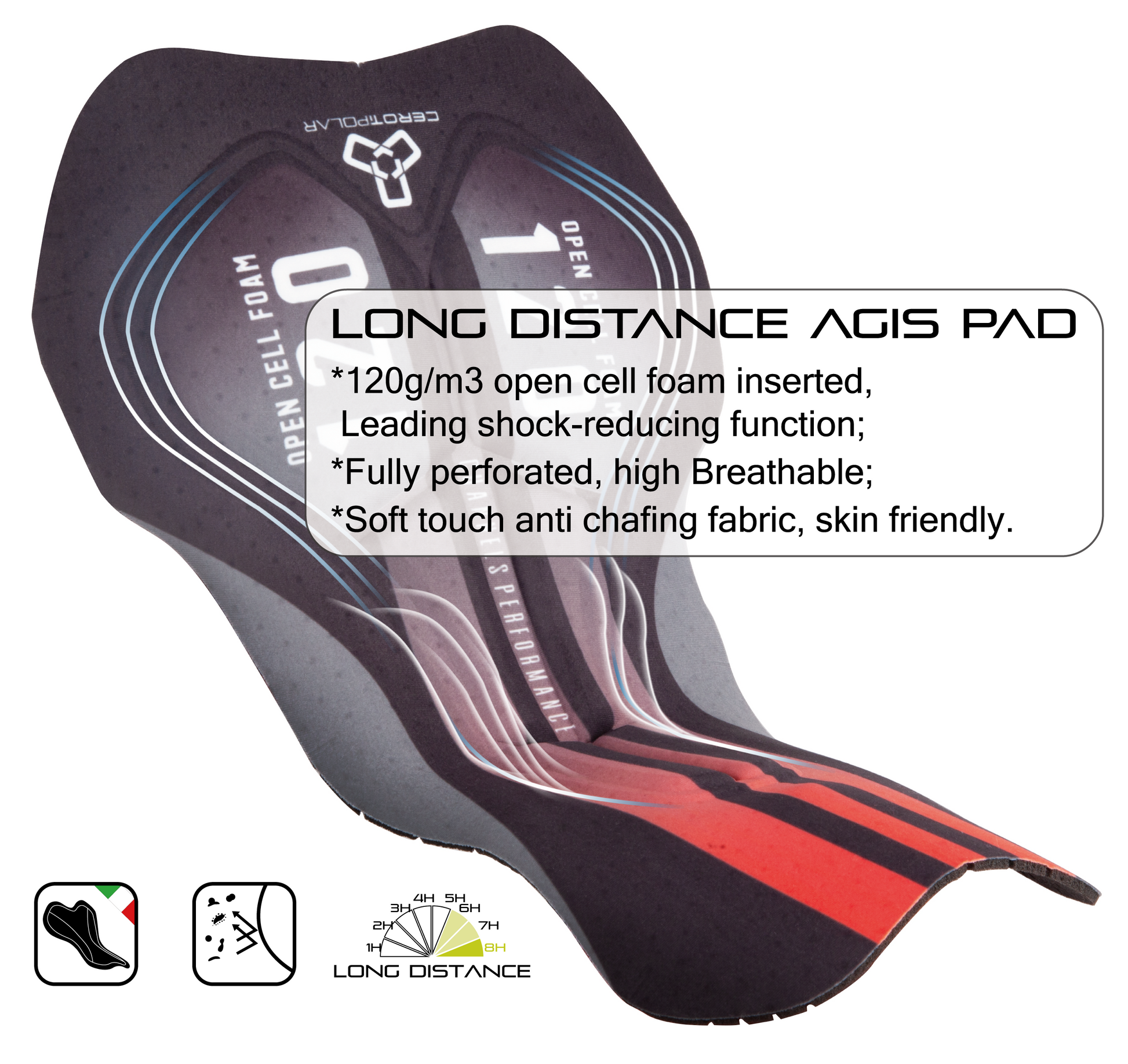 - Long Distance pad. 120g/m2 Agis Shield open cell foam inserted on the sit-bone, best shock reducing and support. High breathable perforated construction enhance fresh and dry during your 8hours ride;